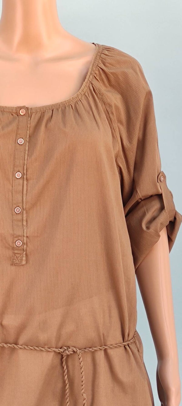 Style: langarm, krempelbar mit Knopfband, Knopfleiste und Rundhals, Gürtelband, leicht durchscheinender Stoff