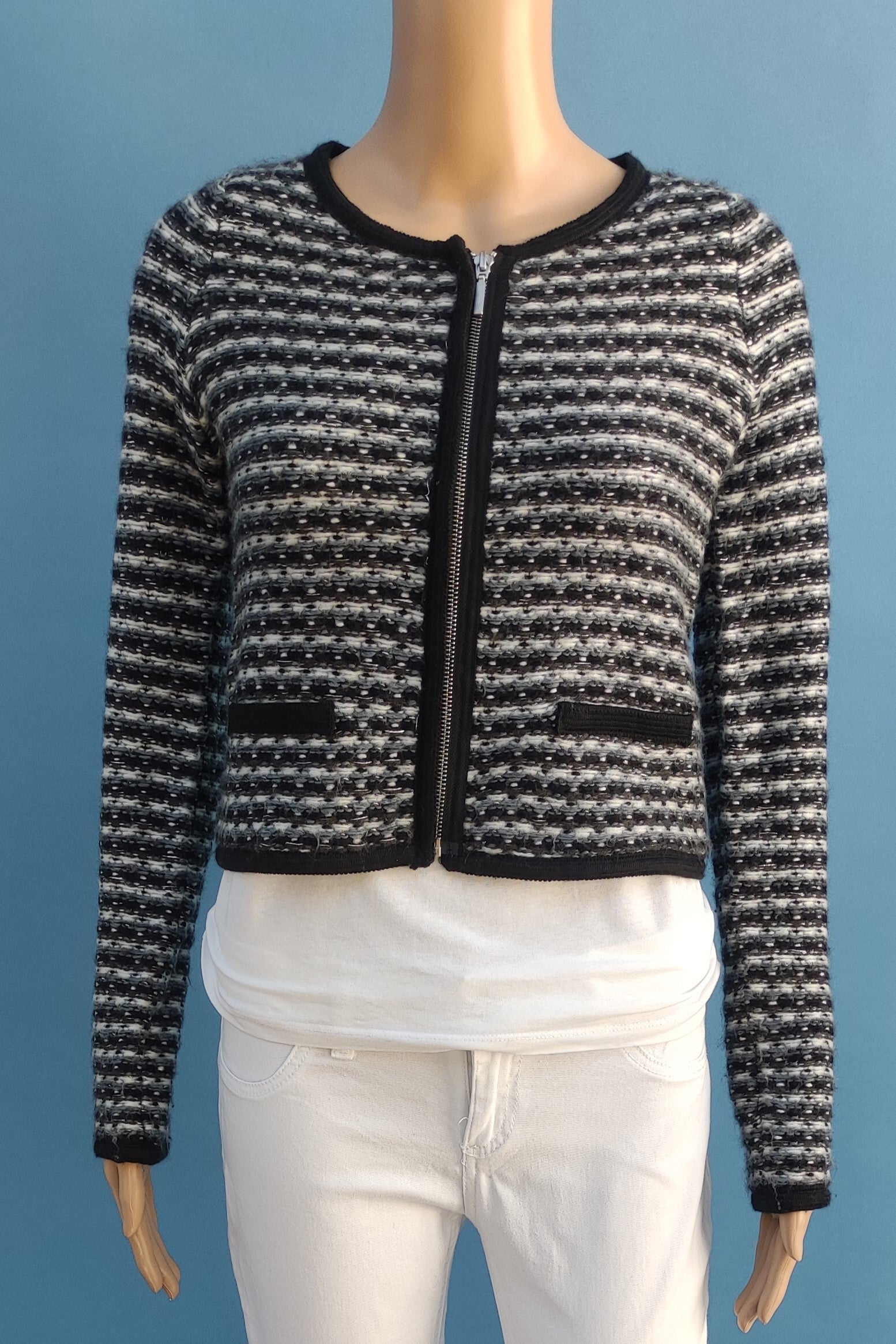 Style: kurzer Schnitt, Reißverschluss vorne, gestreift/meliertes Glitzeranteil Muster, 2 Dekotaschen vorne