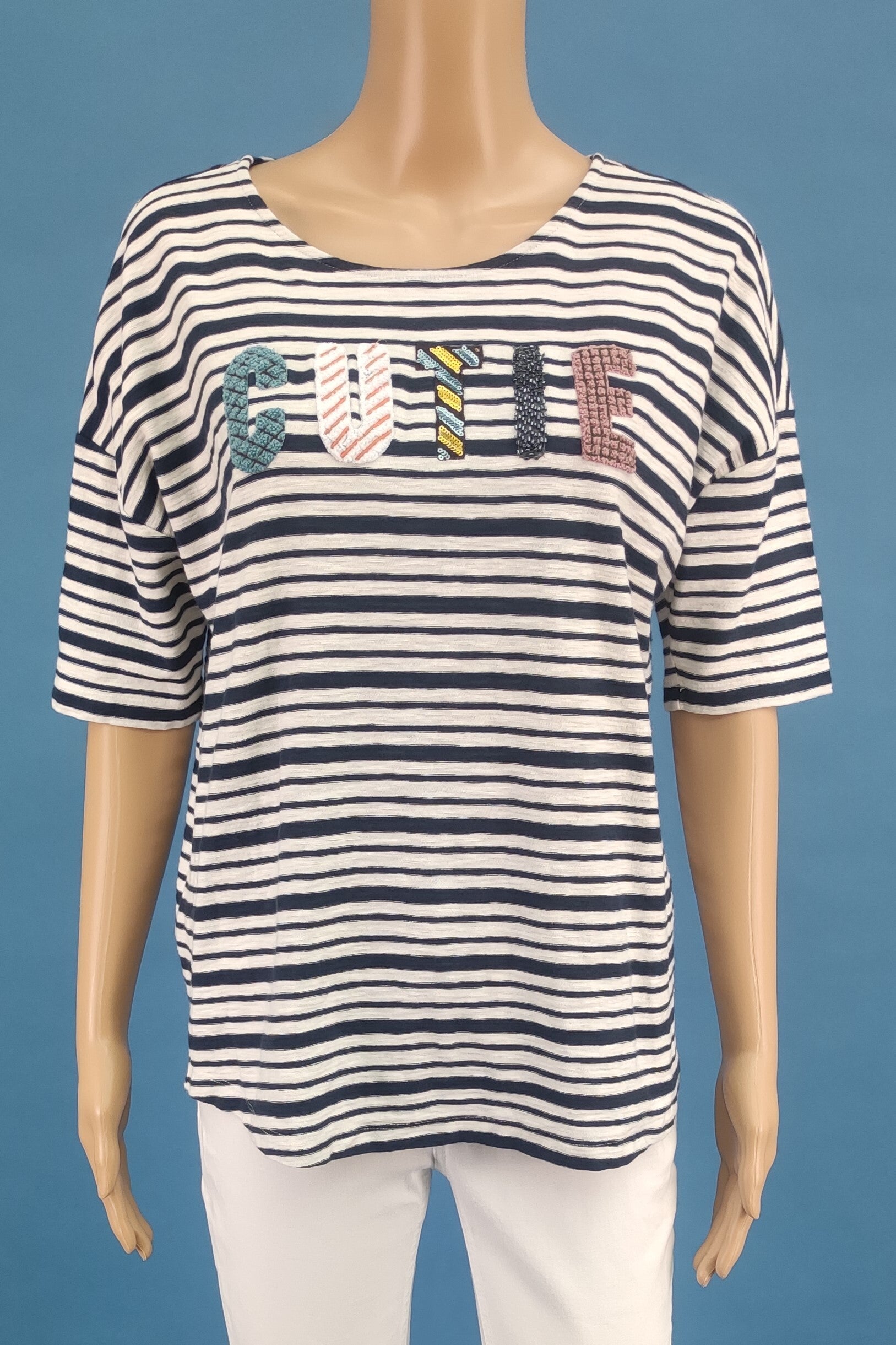 Style: Rundhals, Streifen-Muster, Schriftaufnäher mit Perlen, Pailietten und Strick