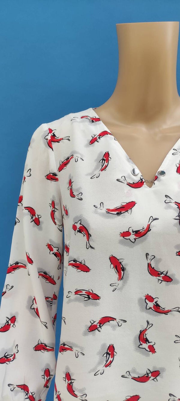Style: langarm, V-Ausschnitt, kleine Kette und 2 Dekoknöpfe am Ausschnitt, Fisch-Muster, Schleifenband am Ärmelsaum