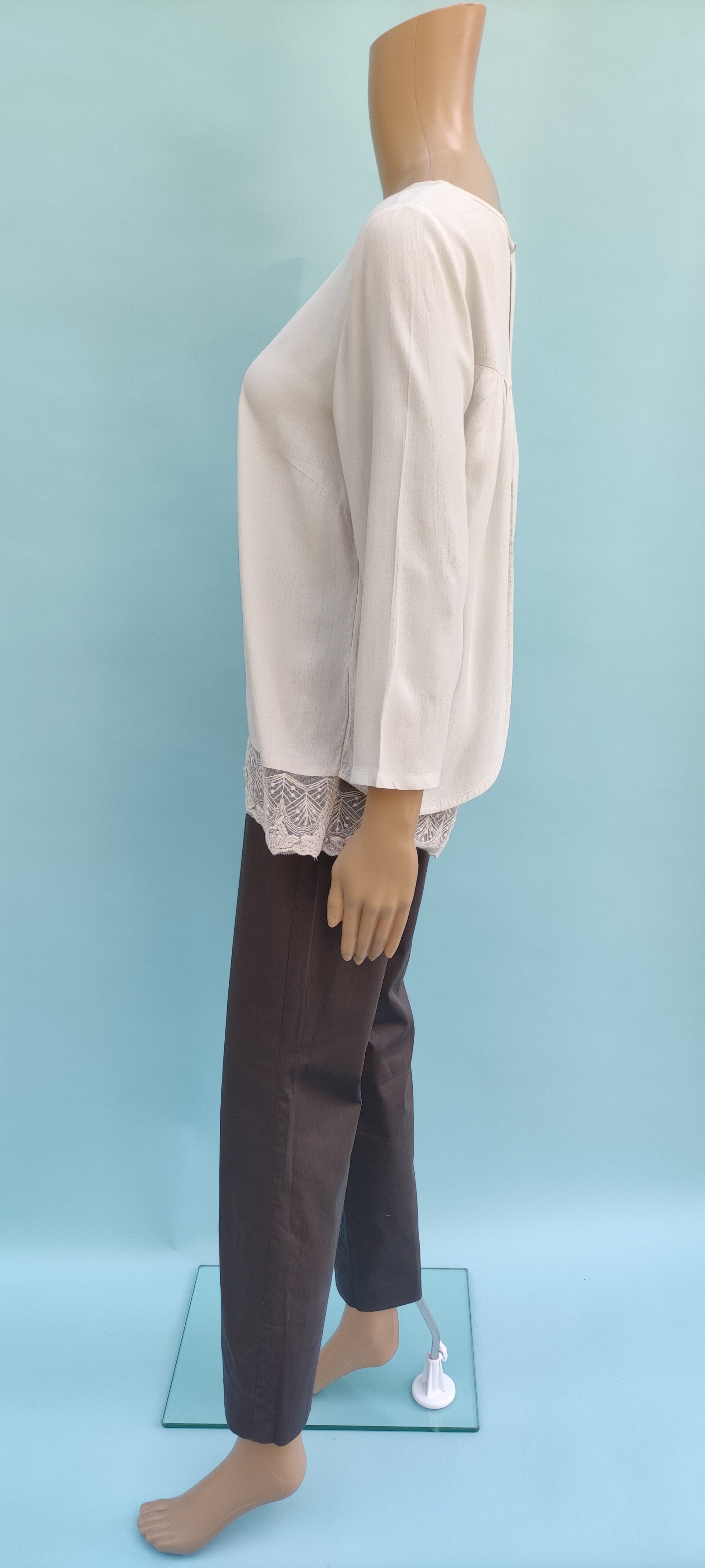 Style: Rundhals, 3/4 Arm, Spitze am Saum vorne und am Rücken, offner Überstoff am Rücken