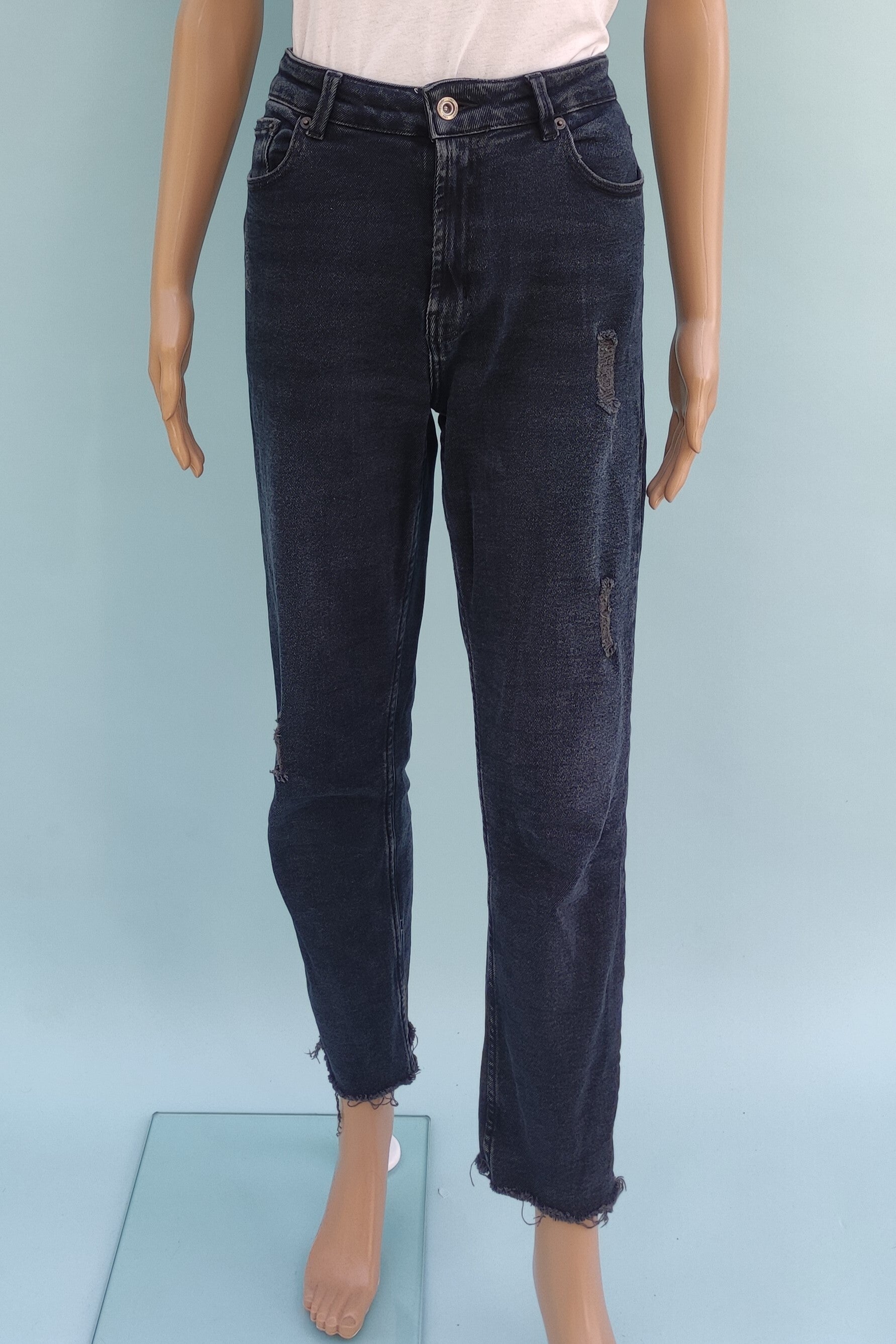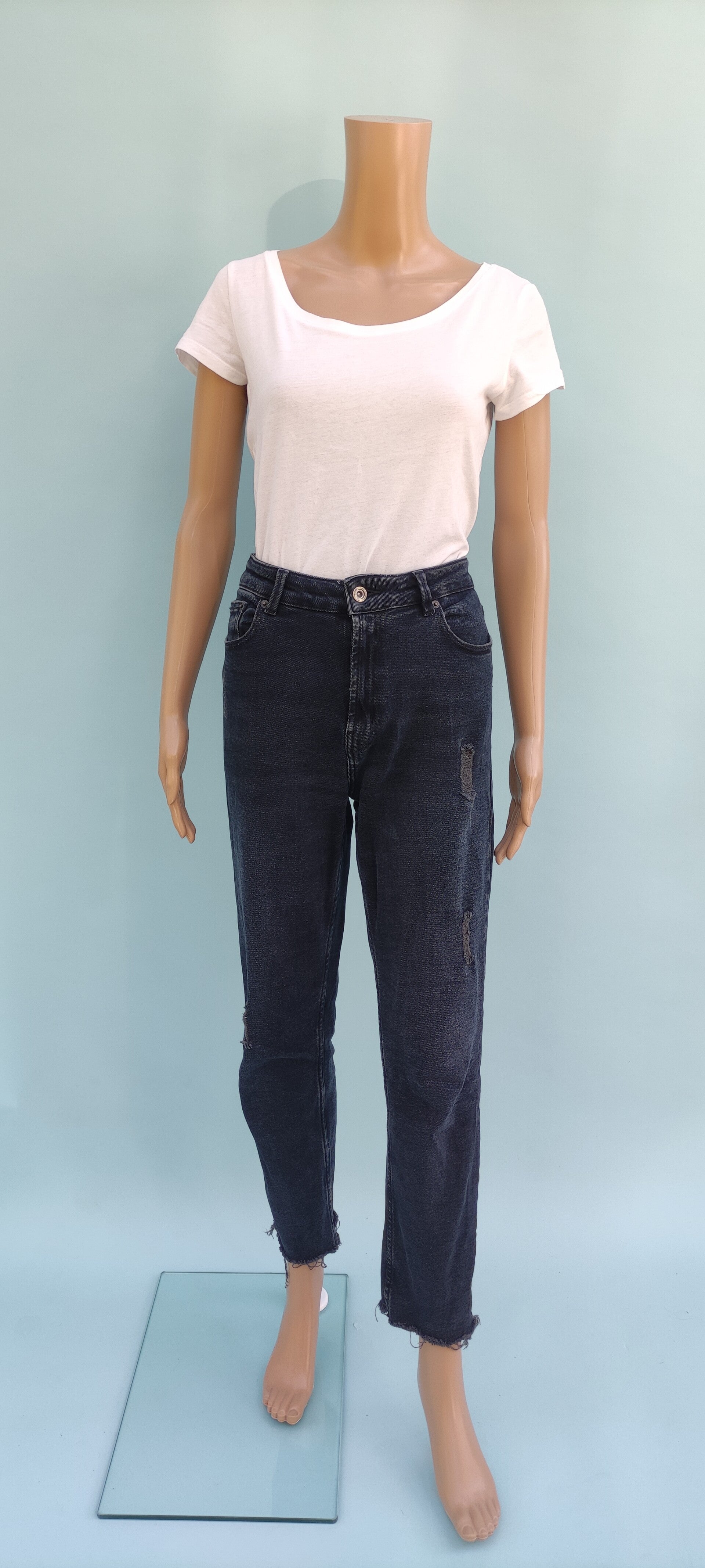 Style: slim fit, high Waist, 5 Pocket-Jeans, fransiger Beinsaum, angeraute Stellen am Bein, Knopf und Reißverschluss vorne