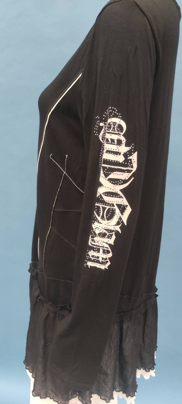 Style: Knopfleiste vorne, Spitze am Ausschnitt, Strasssteine und Schriftdruck am Arm