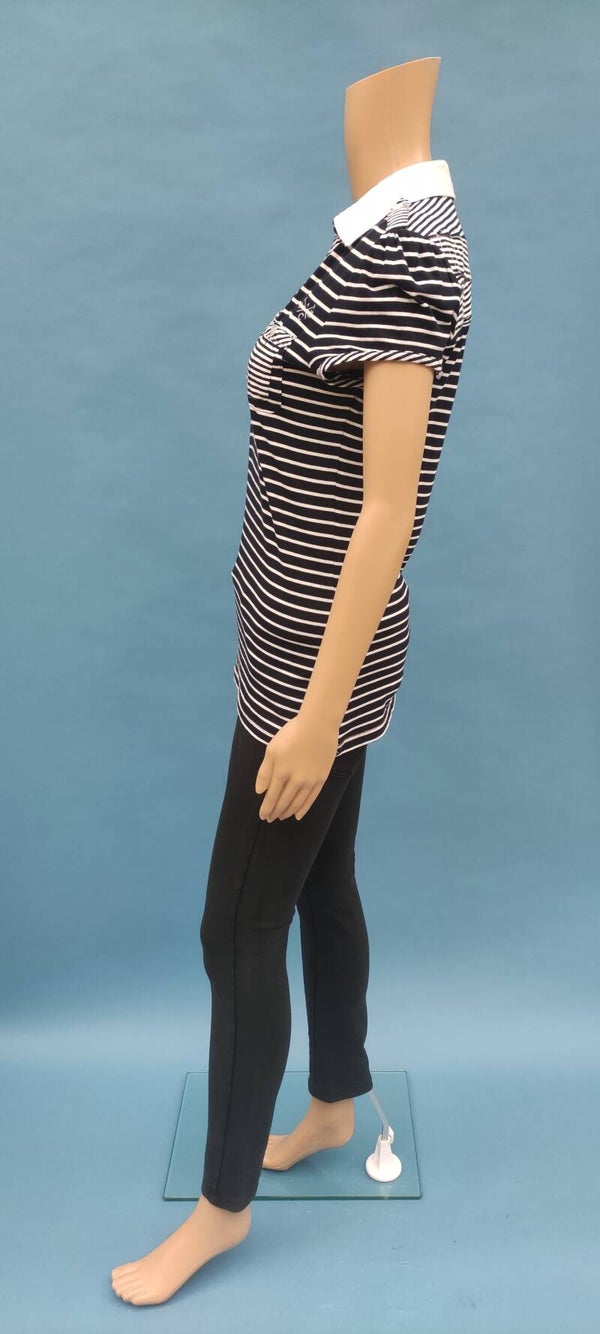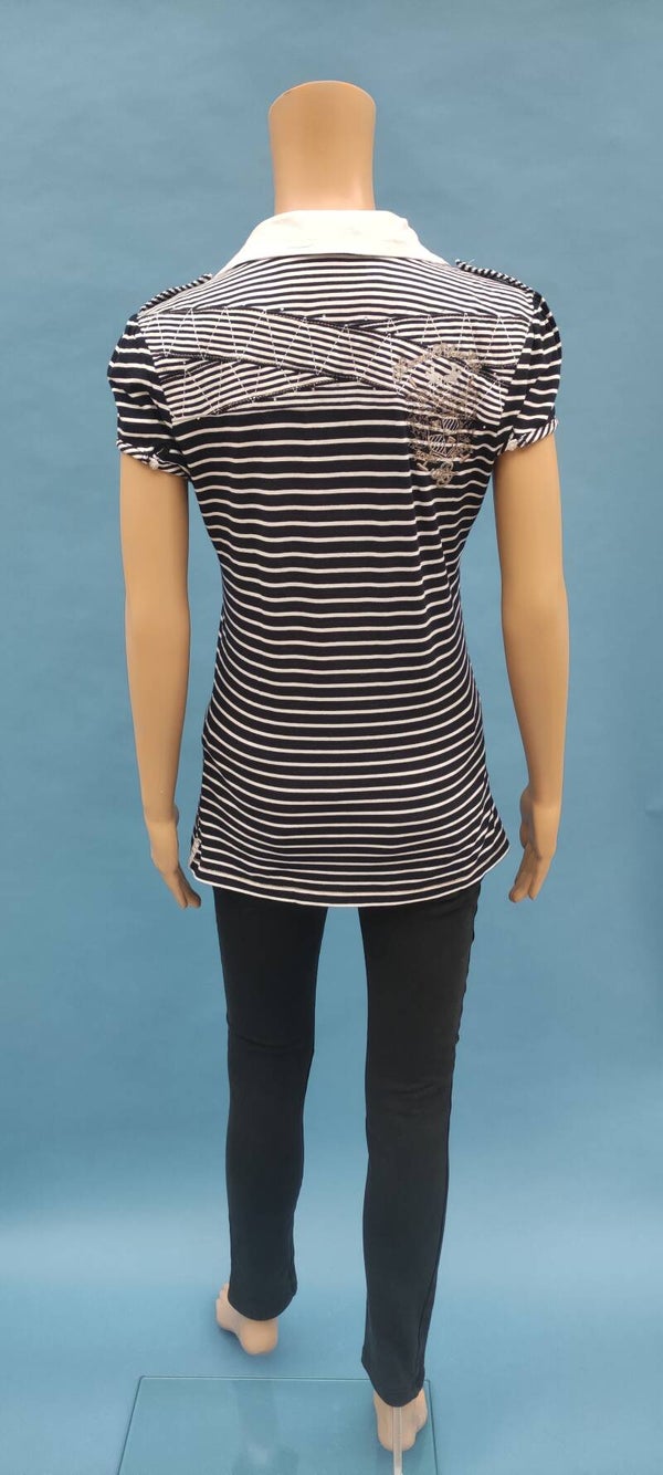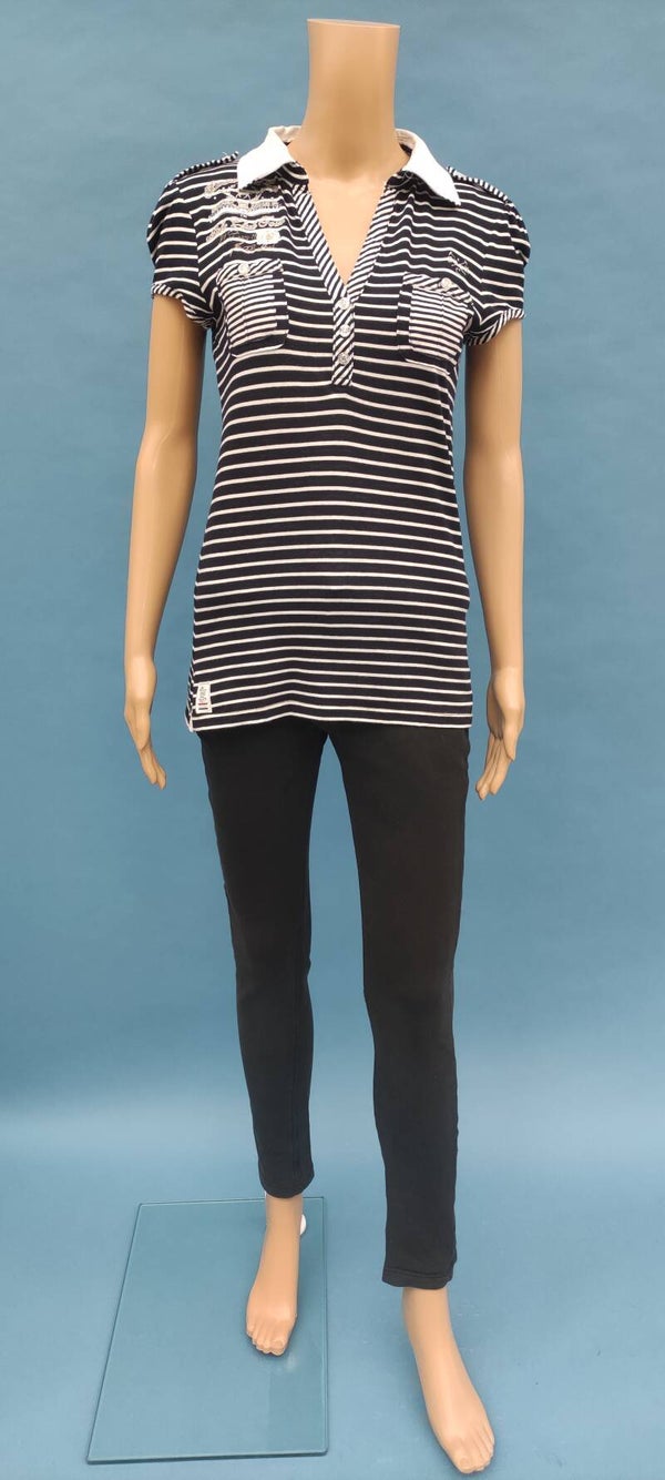 Style: Kragen, V-Ausschnitt, Stickerei-Schrift, Strasssteine, 2 Brusttaschen, Knopfleiste am Ausschnitt, Streifen-Muster