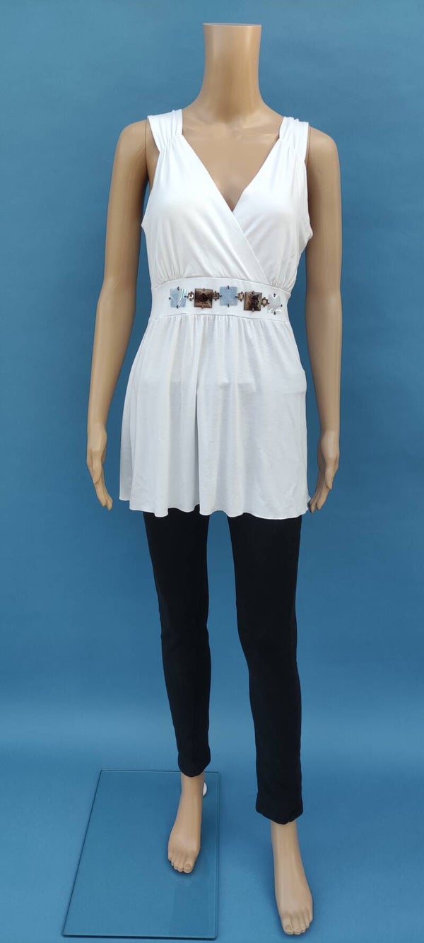 Style: V-Ausschnitt, ärmellos, langer Schnitt, Strassstein- und schimmernde Plätchen und Perlen im Hüftbereich