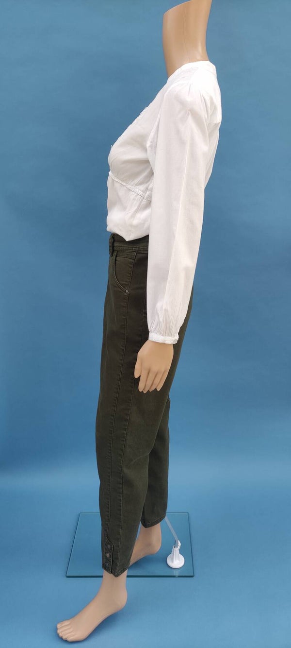 Style: slim fit mit schmaler werdenden Bein, 3 Seitentaschen, 2 Deko-Taschen hinten, Reißverschluss und Knopf vorne, 3 Druckknöpfe am seitlichen Beinsaum