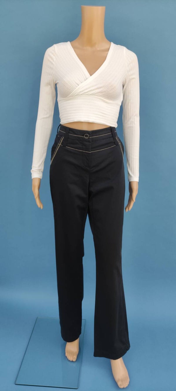 Style: Business, regular, normales Bein, Druckknopf und Reißverschluss vorne, 2 Seitentaschen, 2 Potaschen mit Druckknopf, leicht schimmernder Stoff, Stickerei am oberen Bereich und Taschen