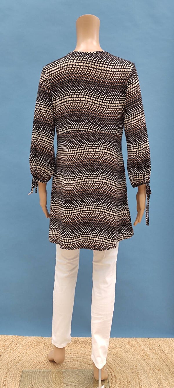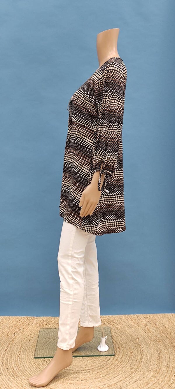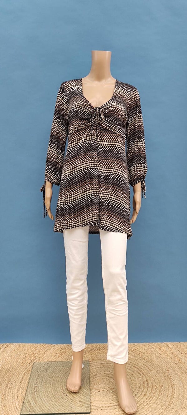 Style: lockerer und langer Schnitt, kurzer Arm, Punktmuster, Schleifenband am Ausschnitt und Armsaum