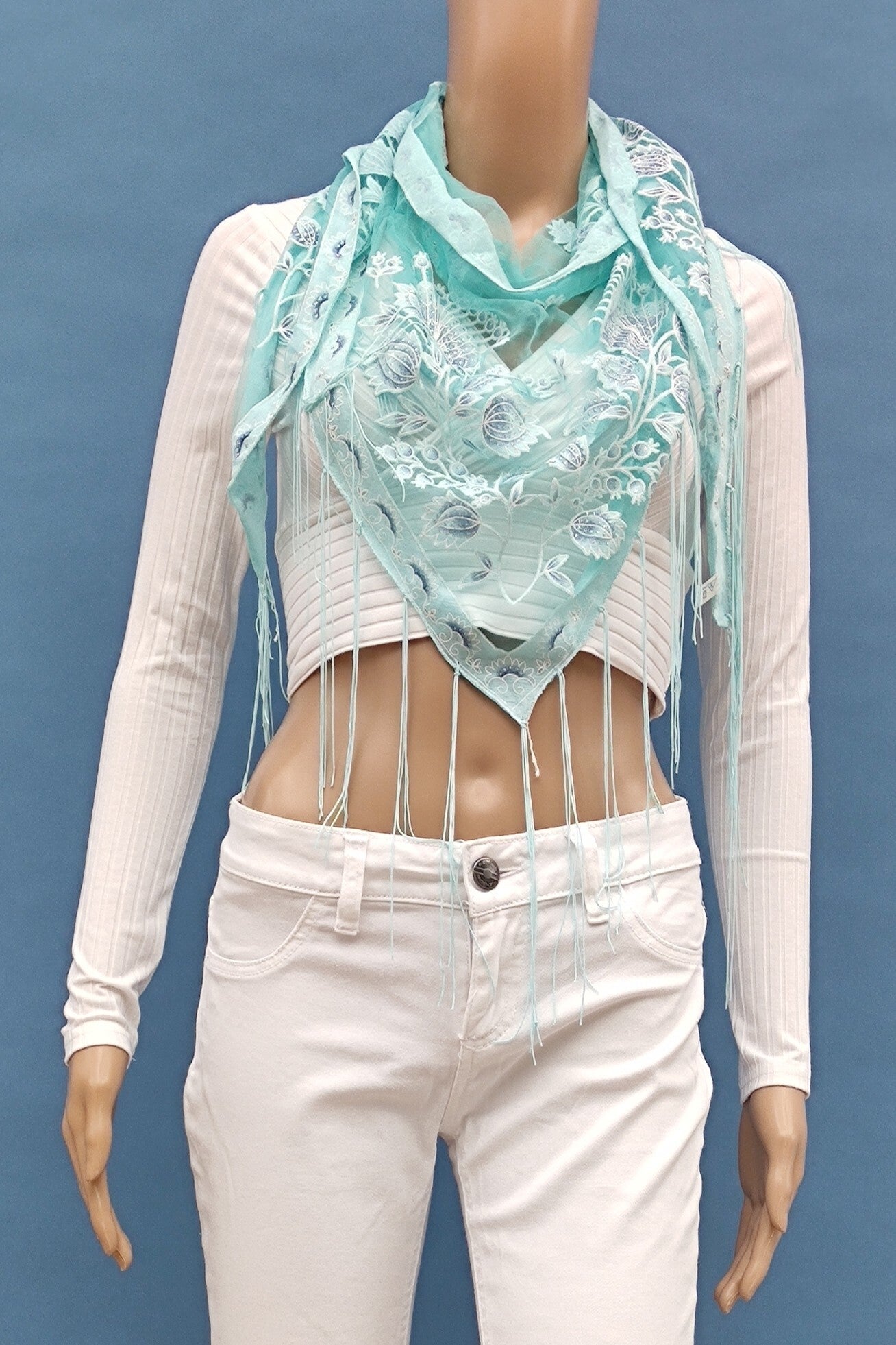 Style: Dreieckstuch mit Fransen, durchscheinender Stoff, als Halstuch oder um die Hüfte tragbar