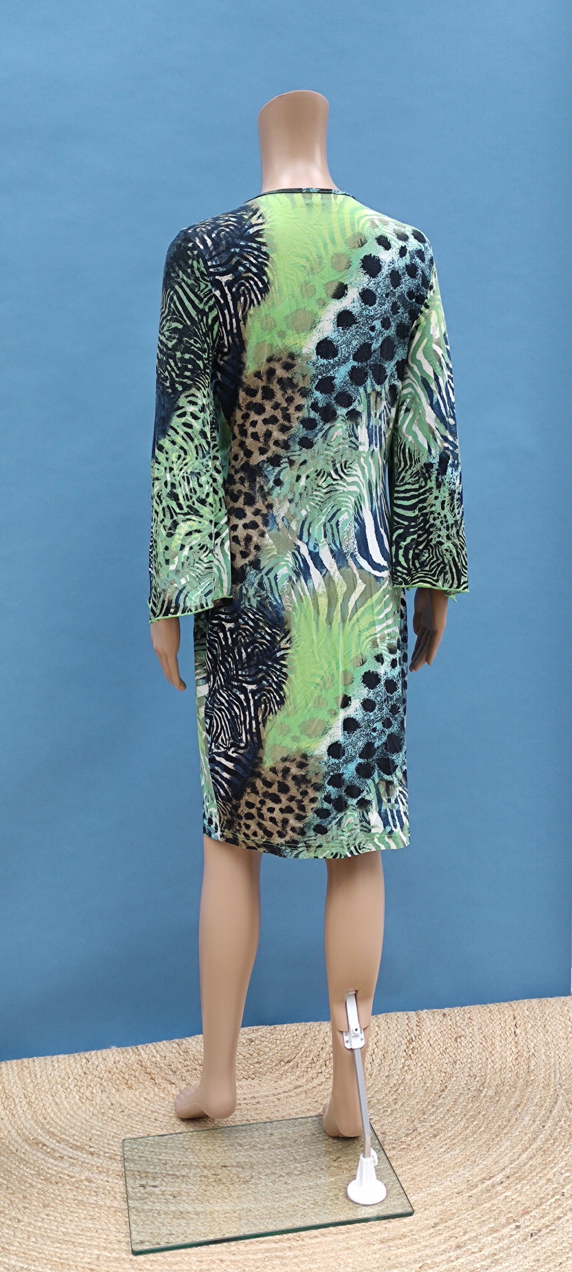 Style: V-Ausschnitt mit angenähter großen ovalen Metallbrosche vorne, breiter werdender offener Armsaum, diverse Musterung