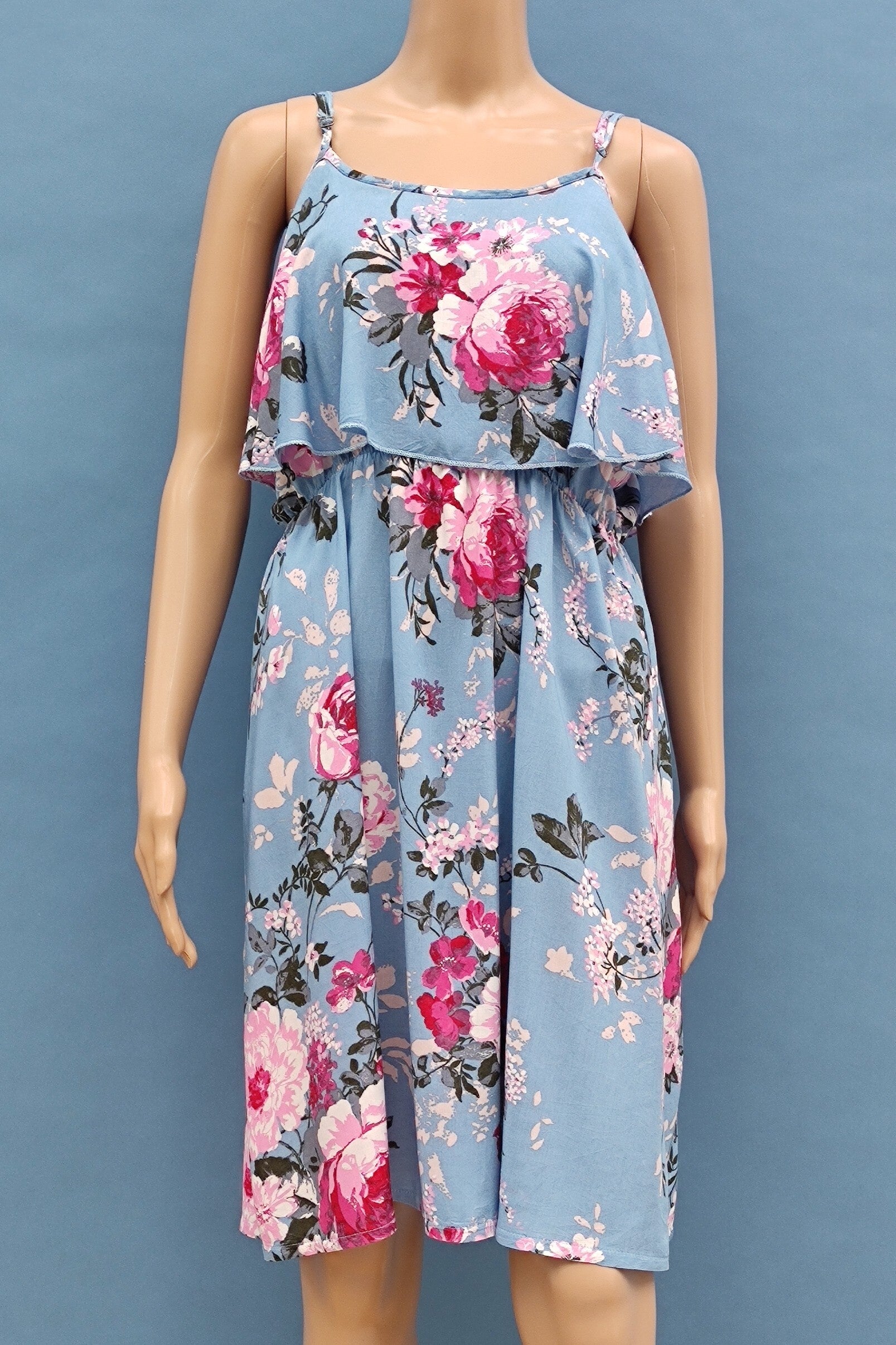 Style: ärmellos, verstellbare Träger, Blumenmuster, hängender Überstoff am Brustbereich, Gummibund an der Taille