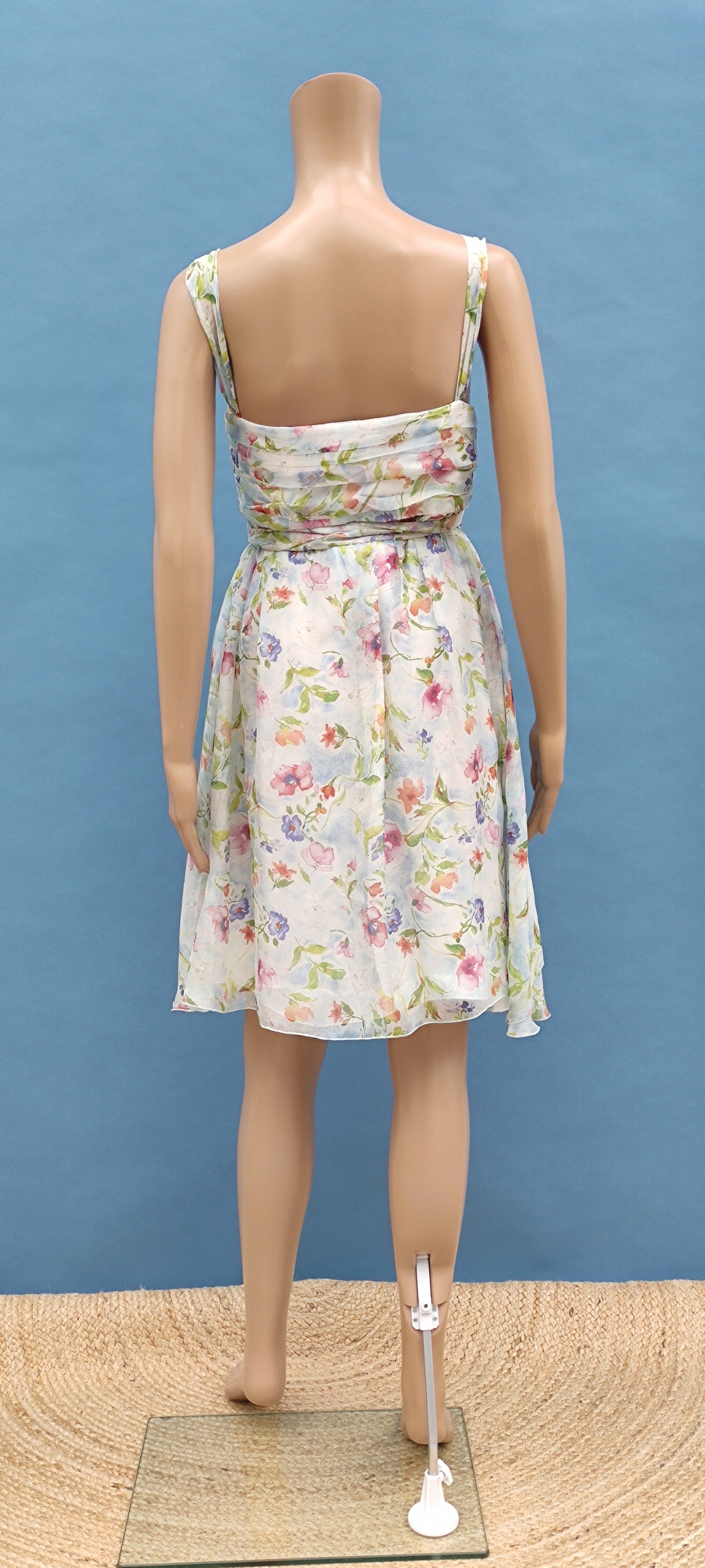 Style: leichter durchscheinender Seidenstoff, Blumenmuster, Faltenraffung am Brustbereich, Schleifenband, seitlicher Reißverschluss